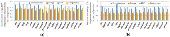 Execution time, energy, EDP, and temperature normalized to the base configuration for priority settings (a) T and (b) X.