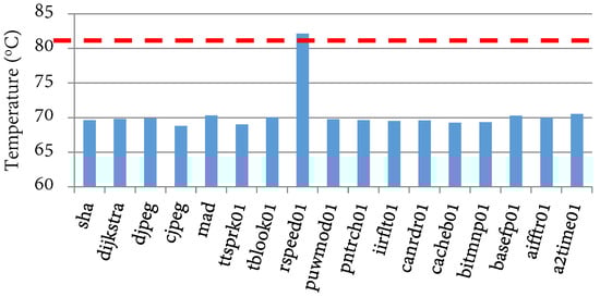 Figure 8b depicts the average execution time, energy, EDP, and temperature savings for a priority setting N (energy prioritization) and an 82 °C temperature threshold. The execution time, energy, EDP, and temperature reduced by 4%, 31%, 34%, and 20%, respectively. We also evaluated TaPT’s optimization behavior within a temperature specified temperature constraint. We evaluated this behavior using an 82 °C temperature threshold, indicating that energy is minimized as long as the temperature does not exceed the threshold. Figure 10 depicts the phases’ peak temperatures with respect to the threshold temperature of 82 °C. TaPT maintained the temperature at or below 82 °C for all the phases, but did not minimize the temperature. The 82 °C threshold allowed for greater execution time, energy, and EDP reduction than a system that prioritized the temperature or one with a lower temperature threshold. This option is suitable for situations where the temperature constraints are known and can be specified by the designer.