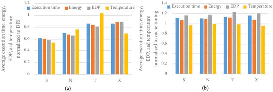 Figure 11a depicts the average execution time, energy, EDP, and temperature of the best configurations as determined by TaPT normalized to the best DFS configurations (best frequency), using the base cache configuration for priority settings and X. With the default priority setting S, TaPT reduced the average EDP, energy, execution time, and temperature by 41%, 39%, 38%, and 46%, respectively, as compared to DFS. With priority setting N, TaPT reduced the average EDP, energy, execution time, and temperature by 34%, 32%, 29%, and 24%, respectively, as compared to DFS. With priority setting T, TaPT reduced the average EDP, energy, and execution time by 19%, 16%, and 14%, respectively, as compared to DFS. However, TaPT increased the average temperature by 3% as compared to DFS. This temperature increase was due to TaPT’s optimization of other design objectives while prioritizing the temperature. DFS achieved lower temperature than TaPT because of the significant impact of the clock frequency on temperature. Finally, with priority setting X, TaPT reduced the average EDP, energy, execution time, and temperature by 11%, 11%, 14%, and 31%, respectively, as compared to DFS. These results illustrate TaPT’s ability to optimize multiple objectives while prioritizing the designer’s selected priority setting.