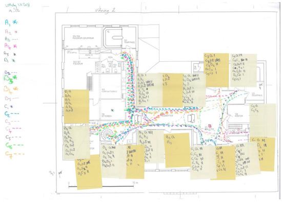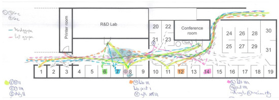 In order to arrive at a well-grounded conceptual framework, we have conducted two extensive ethnographic studies lasting for more than 5 months in two different office-based workspaces (two different companies). During the ethnographic prestudies, we gathered field notes and sketches of local movement and mobility in the office layout (see Figure 2). Ethnographic studies have been considered as a common approach in the fields of HCI (Human Computer Interaction) and CSCW (Computer Supported Collaborative Work) [28,29,46]. There has in fact been a wide range of ethnographic studies conducted in workplaces with a specific focus on collaboration or efficiency [30,31]. However during the last two decades of the 20th century, with the introduction of information and communication technologies, the concept of mobility has expanded and transformed [47]. Limited numbers of studies have focused on local movement and mobility in workspaces in order to increase collaboration [30,31]. Mobility is considered essential for the use of shared resources and communication [30]. While conducting our ethnographic studies, we very soon realized the need for local movement and mobility as social practices in workspaces (see Figure 2). In fact, office workers are mobile during work hours, and movement is constantly shaped and reshaped.