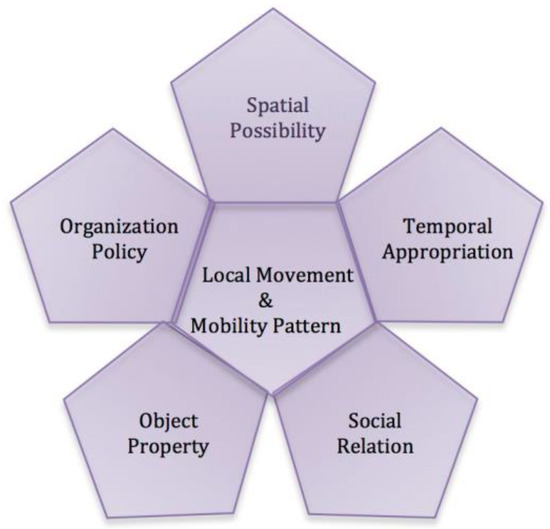 On the basis of our ethnographic work, we have developed a conceptual framework that identifies five categories of agency that are influential in shaping patterns of local movement and mobility in workspaces (see Figure 3). The process behind the development of this framework consisted of the thematic analysis of the field notes and informal interview transcripts gathered in our observational ethnographic study. The process of data collection as well as the coding was conducted by one of the authors. Initially, the field notes from the study were carefully coded to more than 1200 open codes. These 1200 codes were clustered into five categories. This framework provided us with a deeper understanding of the existing mobility pattern in workspaces. This understanding of the current movement in offices is important for designing novel PI systems for increasing physical activity among office workers. The five categories are as follows.