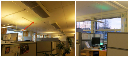 NEAT-Lamps were installed on the desks of six volunteers for around 2 months. These volunteers all worked within the same space of a work environment. Initially, all the office workers of that company were informed about the dangers associated with prolonged sitting, but they were not introduced to the NEAT-Lamp prototype or the details of the study. After the presentation, six office workers volunteered to participate in the study. During this time, observational studies were conducted as the office workers interacted with the prototype. At the beginning of the study, we were interested to investigate how our lamp, as an additional object added to the workspace, encouraged individuals to alter their movement and mobility patterns. However, after a day, we realized that the lamp when lit illuminated the ceiling, making it visible to everyone in the environment (see Figure 6). Therefore the interaction between the office worker and the lamp was not limited to the individual, but was visible to everyone in the workspace. This light shining on the ceiling created open-ended discussions among office workers concerning their stationary habit when working on computers. As former studies also indicate, office workers would rather know about each other’s identity and their activity levels in order to have discussion with one another [12]. Additionally, Lin et al. notify that office workers felt more comfortable to have discussions about their activity level with those participants that they were aware of their identity. The same also happened in our study; when we asked the participants if they wanted to withdraw from the study because of privacy matters, they all agreed to continue with the study, and no one felt that their privacy was questioned. Some office workers enjoyed the green light and ignored its message; others tried to change the current situation. In the following, we give two examples of the behavior we observed.