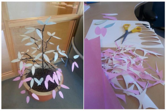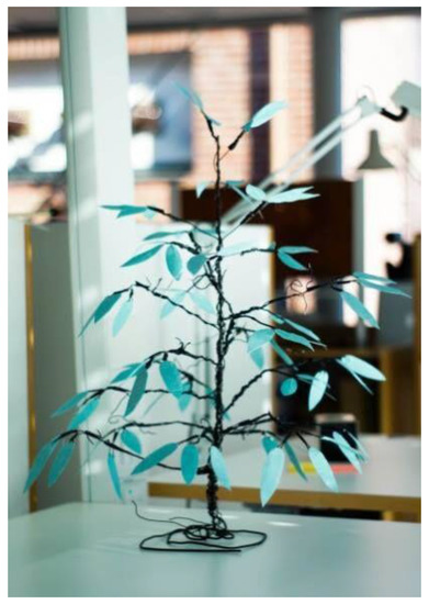 The Talking Tree is a proximity sensor-based interactive plant that reflects the amount of local movement within a corridor by changes in the color of its leaves (see Figure 7 and Figure 8). Sensitive colour paper was used for the leaves of this prototype. The idea behind the design of this ambient display is that, on the basis of a predefined parameter measured by a sensor, when a specified threshold is crossed, the leaves will change colour from green to white (Figure 7 and Figure 8). The leaves of the Talking Tree are green until local movement and mobility decreases within the workspace, at which point the sensor is activated and the green colour fades to white. Thus, if there is no movement around the sensors, the Talking Tree will change colour.