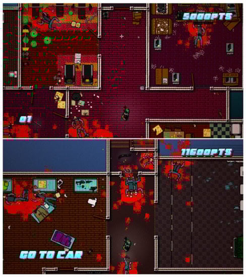 Hotline Miami levels are best examined, like for example top down dungeon crawlers and non-digital games such as Dungeons & Dragons [,,,,]. Action based Role Playing Games (ARPGS) such as Diablo are close to the feel of Hotline Miami, however, the level size is much larger in Diablo, and considerations of line of sight are not as pressing in a hack and slash world with a character able to take a number of hits, compared to the immediate death and re-spawn mechanic of Hotline Miami. See Figure 1 for examples of the levels.