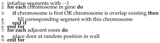 The core of the algorithm is the level building step, see Figure 4, which takes a chromosome and subsequently adds each rectangle to the level. During that process a room is created and assigned a list of segments that belong to the room. If overlapping rooms split another room into two sections, then they will not be placed. After all chromosomes have been added, the algorithm places a door between adjacent rooms.