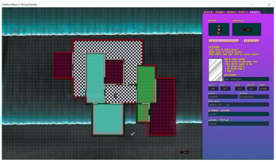 - Brown, J.A.; Lutfullin, B.; Oreshin, P. Procedural Content Generation of Level Layouts for Hotline Miami. In Proceedings of the 2017 9th Computer Science and Electronic Engineering (CEEC), Colchester, UK, 27–29 September 2017; pp. 106–111. [Google Scholar]