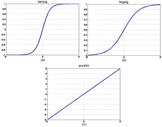 In the above equation, (N) is the number of tested samples; (ti) represents the neural network outputs; and (ai) represents the actual and available outputs. For more information on all types of activation functions, in the MATLAB software, three activation functions—a sigmoid tangent, a sigmoid log function and a linear function—are displayed in Figure 1.