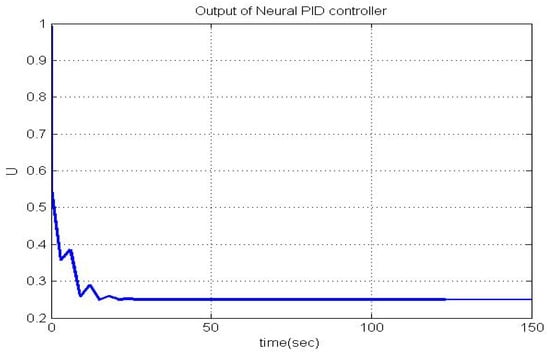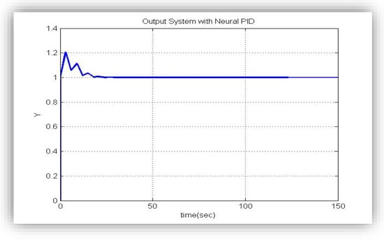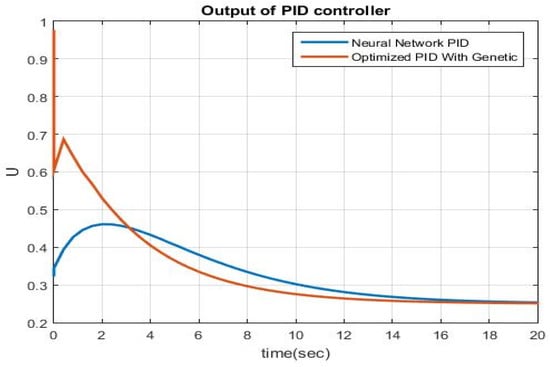 According to the discussion in the previous section, the final designed neural network is as follows. The number of hidden layers of the designed network was considered to be two layers. The hidden layer consisted of a logsig activator function and the output layer of the activator function was also the logsig function. Additionally, the training algorithm was the genetic algorithm. The size of the layers by using the values obtained in the table was 5, therefore there were 5 neurons for the hidden layer. The output waveforms along with the output of the PID controller are shown in Figure 9, Figure 10, Figure 11 and Figure 12.