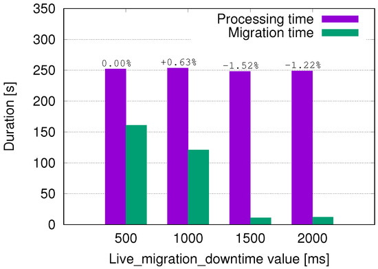 Figure 4). We measured a smaller (almost negligible) increase in the service processing time while using the two larger downtime values. We also see the great reduction in total migration time when using such longer downtime values. From this evaluation, we conclude that setting longer live migration downtime values is often beneficial both from service and migration performances, hence we fixed these parameters to 2000 ms in all successive trials.