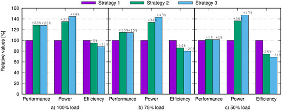 Figure 6 shows that, for full-load utilization, Strategies 2 and 3 have almost identical performance (+28% with respect to Strategy 1), but different power profiles (+35% and +44% increase). Strategy 1 is undoubtedly the most efficient solution (+5%, +11% than other Strategies), though this comes at the cost of worse performance. We can say that Strategy 2 is better than Strategy 3, since we have higher efficiency and lower power consumption with the same performance level. Instead, comparison between Strategy 1 and Strategy 2 is not straightforward because it depends on the overall optimization objectives (which may lean towards performance or energy saving). In general, Strategy 1 is preferable, since the energy saving is larger than the performance penalty, hence efficiency is higher with respect to the other scenarios.