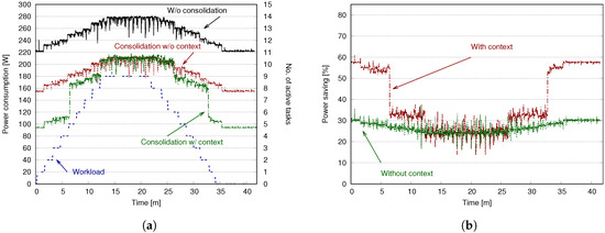Figure 7a shows the measured power consumption in the three different scenarios: (i) without consolidation; (ii) with a consolidation procedure that does not take into consideration context information; and (iii) with our consolidation scheme that uses context information.