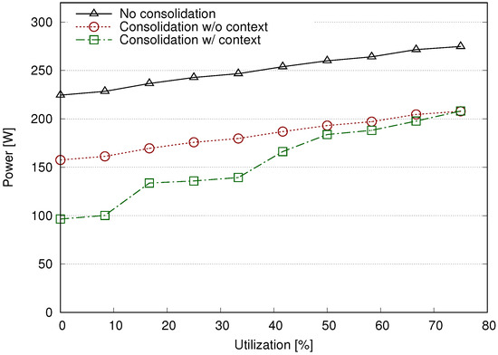 Figure 8 shows that, using context information, we can achieve a better linear relationship between server utilization and power consumption. Indeed, the linearity is more evident in lower power consumption corresponding to scarce utilization. The overall curve has a more stepwise shape with respect to other scenarios, and this can be ascribed to the small number of devices in the testbed. When more devices are used, together with dynamic voltage/frequency scaling mechanisms, the stepwise behavior becomes negligible.