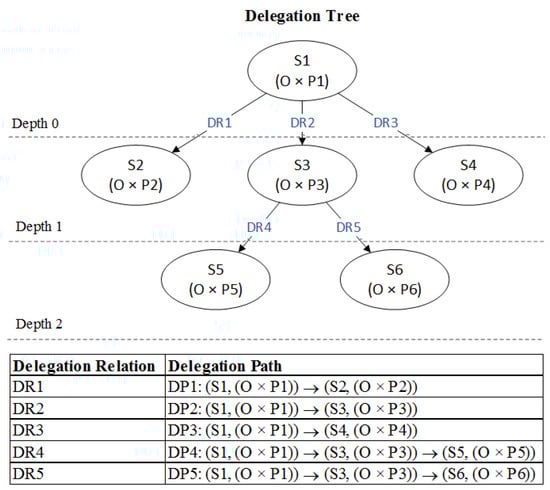 - is the one-to-many delegation relationship. A delegation relationship can be represented by , where P2⪯P1. It indicates that subject S1 delegates subset of P1 to subject S2 as P2.