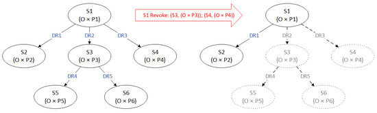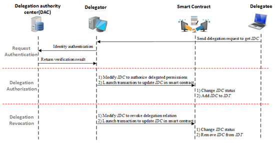 - Delegation Revocation: The delegation revocation considers two scenarios: delegated permission P revocation and delegation certificate revocation. According to the revocation mechanism defined in FCDM, only entities who meet the relationship can carry out revocation operations over a smart contract. In the delegated permission revocation process, the delegator can nullify part of the assigned permissions by simply removing access right elements from in the delegatee’s . In the case of revocation, through cascading, all subsequent delegate relationships are removed from the . By starting from the delegator and destructing the delegatee’s , the delegator can tear down all delegation relationships that are associated with delegatee, including those assigned by the delegatee.