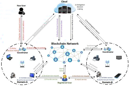 - Federated Delegation: The PDC service at the cloud server is responsible for delegation policy definition and access right authorization enforcement. To reduce the overhead of the centralized cloud server and meet the scalability and heterogeneity requirements in each IoT domain, the domain coordinator delegates part of the policy decision making tasks and carries out domain specified authorization rules based on domain-specified policies. After receiving a delegation request from a coordinator candidate and executing a policy decision making task to delegate permissions to the coordinator, the PDC service on the cloud launches a transaction to issue a delegation certificate to the smart contract. Finally, the federated delegation relationship is established between the cloud server and the coordinator, and profile and policy data synchronization between the cloud and coordinator is periodically carried out to ensure data consistency on both sides.