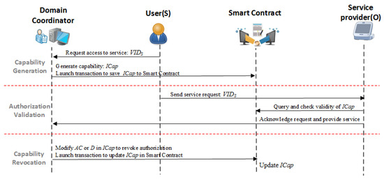 - Capability Authorization: To successfully access services or resources at service providers, an entity initially sends an access right request to the domain coordinator to get a capability token. Given the registered entity information established in the profile database, a delegated policy decision making module running on the domain coordinator evaluates the access request by enforcing the delegated authorization policies. If the access request is granted, the domain coordinator issues the capability token encoding the access right and then launches a transaction to update the token data in the smart contract. After the transaction has been approved and recorded in a new block, the domain coordinator notifies the entity with a smart contract address for the querying token data. Otherwise, the access right request is rejected.