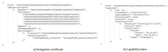 - Capability Generation: As one type of meta data that represents the access rights, the capability, , can be generated by associating a VID with an AR; thus, the has the identified property to prevent forgery. After receiving an access request from a user, the domain coordinator generates a capability token based on the delegated access right authorization policy, and launches transactions to save a new token data to a smart contract. A large number of ’s are grouped into the capability pools on the smart contract which can be proofed and synchronized among the nodes across the blockchain network.