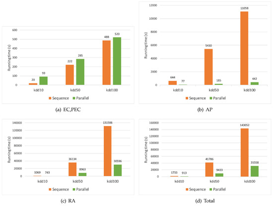 - In AP and RA steps, the parallel algorithms outperform the sequential algorithm. To the dataset Kdd100, the former performs 25 times faster than the latter at the AP step, and four times faster at the RA step, respectively. This is important since these are the most intensive computational steps. For the EC, PEC step, the parallel algorithm costs more time. This is because we divide this step into two separate MapReduce jobs: EC and PEC. Since each job requires a certain time to start up its mappers and reducers, the time consumed by both jobs becomes larger than the one of the sequential algorithm, especially when the input data is small. Notice that the time difference becomes smaller when the input data is larger (63 s in case of Kdd50, and 32 s in case of Kdd100). It is intuitive that the parallel algorithm is more efficient if we input larger datasets. In addition, since this step costs the least amount of time, it will not impact the total execution time of both algorithms.