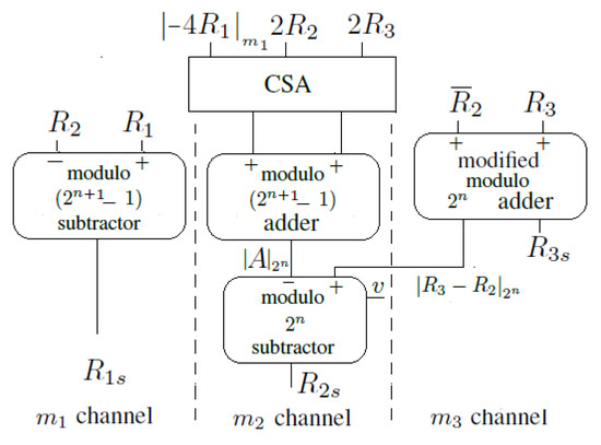 The proposed hardware implementation of the CRT-based scaler of the moduli set is shown in Figure 1. The carry-save adder (CSA) of Figure 1 consists of full adders operating in parallel. The modulo adder, modulo subtractor, and modulo subtractor are described thoroughly in [19]. The modified modulo adder is described in the last paragraph of this section.
