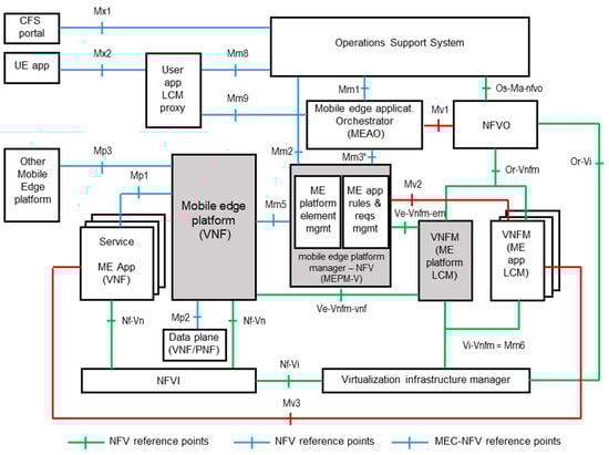 ETSI MEC has carried out a specific activity to integrate MEC and NFV; Reference [10] summarizes the results obtained and Figure 3 shows the proposed MEC in NFV reference architecture.