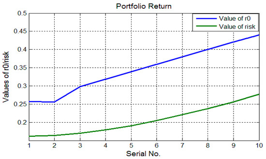 The values of portfolio weights are zero for columns 1, 2, 3, 4, 6, 7 and column 9. The portfolio return is computed on a sample data given in [33]. The variations of output values of and risk are shown in Figure 2.