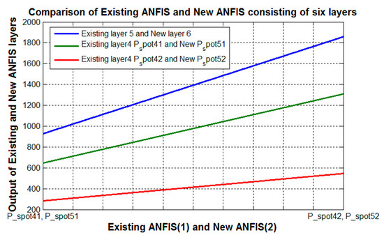 Corresponding to the final output of modified ANFIS, as given in Table 14, Table 15 and Table 16 we find that the output of layer 6 is 888.7410 (by changing layer 2 and layer 5 simultaneously) and the output of existing ANFIS layer 5 is 1606.3 (given in Table 13). Since this output is a performance index for the ANFIS model, it can be seen that the modified ANFIS provides a very less value of this index. Hence, it is accurately modeling the different layers of the system. The output of the ANFIS system final by changing only layer 2 is 1527.0. Therefore, it has an impact on the final output compared to the output of existing ANFIS, which is 1606.3. Similarly, the output of ANFIS system by changing only layer 5 is 925.8. It is seen that the modifications done in layer 5 have a greater impact in changing the final output of ANFIS. The impact of changing layer 5 can be seen in Figure 13. The impact of changes made in layer 2 and layer 5 is shown in Figure 14. The existing output values of layer 3 nodes viz. , and new output values of layer 4 viz. , are shown in Figure 15. In addition, the new modified ANFIS obtained by changing layer 2 and layer 5 has the best evaluation performance index as the final output of layer 6. A comparison of values of the output node of last layer for modified ANFIS is given in Table 17.