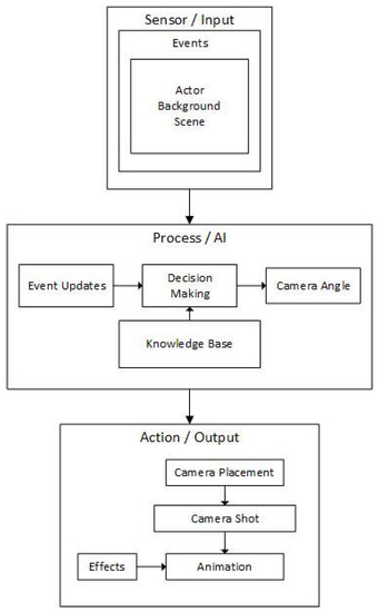 - Elson, D.K.; Riedl, M.O. A lightweight intelligent virtual cinematography system for machinima production. In Proceedings of the Third AAAI Conference on Artificial Intelligence and Interactive Digital Entertainment, Stanford, CA, USA, 6–8 June 2007; AAAI Press: Stanford, California, 2007; pp. 8–13. [Google Scholar]