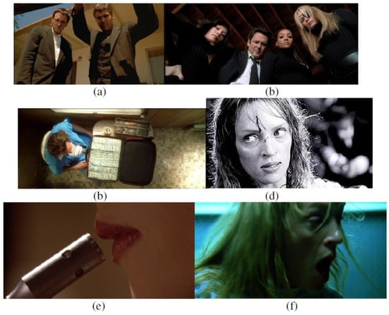 Another famous director is Quentin Tarantino [51,52,53], with a number of successful box office films, including Kill Bill, Pulp Fiction, From Dusk Till Dawn and many more. Quentin Tarantino is a brilliant student in filmmaking and an expert in using cinematic language in his works to express his thrilling stories visually. Every cinophile will know and say that this is his style. Most of his directing styles are action thriller and darkness with the addition of an element of sadism. Figure 3 shows some of Quentin Tarantino’s trademark style.
