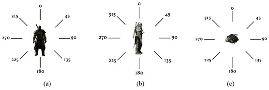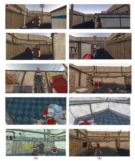 In Figure 20, we can see the same action for the same scene with different camera positions. From the visual perspective, we observe the difference between Quentin Tarantino’s style and generic style. The walk action, as shown in Figure 20a is captured from behind (follow shot), but in Figure 20b, the action is captured from the left side of the character. The first style is follow shot and the second style is left-side-scrolling point-of-view shot. Similar to the fighting action, the first one is captured from over-the-shoulder medium shot, but the second one is captured from the left side using long shot. We designed five different scenes, approximately 24 s–1 min long, and we used 30 fps rate. Hence, we have about 600–1600 frames.