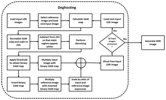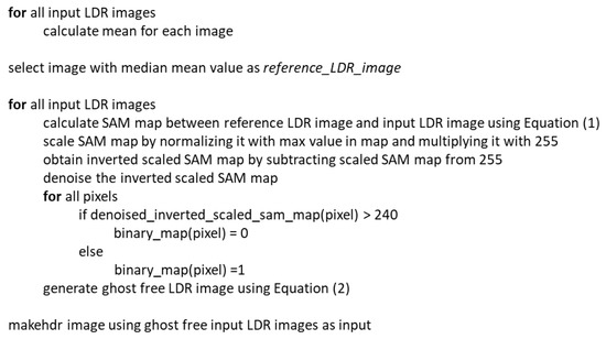 The proposed methodology generates HDR images in three steps. In the first step, regions with movement are identified using the spectral angle mapper (SAM) [31,32]. SAM was preferred over other difference measures because it compares the spectral signature—i.e., the color of two pixels—while being intensity independent. Thus, it can compare the color of two pixels at different exposures. In the context of HDR image generation, if there is no movement between two exposures, then the magnitude of RGB vectors may change; however, the corresponding angle between them should remain the same. The second step revolves around the refinement of the movement mask. The mask generated after SAM may have holes and noise in it. This noise is removed by using the denoising algorithm proposed by Zhang et al. in [33]. Finally, the HDR image may be generated using any method proposed by Reinhard et al. in [34]. A detailed description of the proposed methodology is presented below.