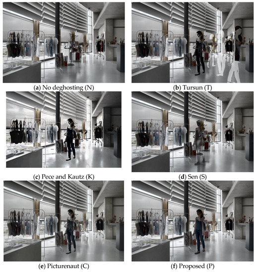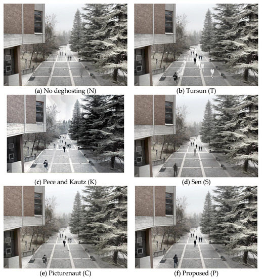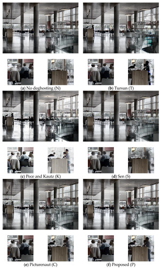 Observing the results presented in Figure 6 and Figure 7 it is clear that the best deghosting results are produced by the proposed method. It may appear that there are no ghost artifacts in Figure 6a; however, a closer inspection of the image reveals a marginally visible silhouette in various parts of the image. These ghost artifacts are clearer in Figure 7a. Ghost artifacts are clearly visible in Figure 6b and Figure 7b, obtained using Tursun et al.’s method [1]. The result obtained by using Picturenaut software, in Figure 6e and Figure 7e, contain both ghost artifacts and holes. The ghost artifact seen in Figure 6e seems to have reduced color information, whereas the ghost artifacts in Figure 7e are clearly visible against a bright background. Methods (K) and (S) seem to present similar issues with deghosting for the person in the ‘Shop2’ image. The person does not appear complete and the colors do not appear natural. In this regard, the proposed method presents the best result among the compared methods, as shown in Figure 7f. Similarly, for the image in which people are walking, the proposed method seems to perform appropriately, removing ghosting, and making the person in the center of the image appear clearly. Sen et al.’s method produces a nearly similar result for the rest of the image; however, the person in the center of the image is not clear and appears blurred.
