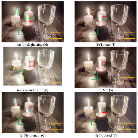 The image set titled ‘Candles’ is challenging as input LDR images not only have movement but also have illumination variation. A red box is used to highlight the difference between the compared algorithms. Except for the result shown in Figure 5d,f, all the other images suffer from ghosting as the texture of the candle stand is not visible. A green box is used to demonstrate both deghosting and the dynamic range of the resultant images. Comparing Figure 5d, obtained using Sen et al.’s deghosting, and Figure 5f, obtained using proposed deghosting, it can be observed that the image presented in Figure 5f is slightly clearer and sharper compared to the image in Figure 5d. Looking at the yellow rectangles it can be observed that the shadow of the glass is hardly visible in images obtained by no deghosting, Tursun et al.’s method, Pece and Kautz’s method and Picturenaut software. The shadow of the glass can be clearly seen in Figure 5d,f, thus indicating that they may have a higher dynamic range compared to the other images. However, looking at the overall quality of these two images, Figure 5f seems to have slightly higher noise in dark regions. Also, the flame and candle wick are more visible in the result obtained by Sen et al.’s method.