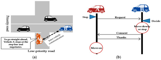 Yielding procedure example at an unsignalized intersection on a crossroads of a priority road and a low-priority road. (a) Situation at an unsignalized intersection: Vehicle A wants to go straight ahead. It stops at the stop line at the intersection and negotiates with Vehicle B; (b) Inter-vehicle communication sequence example in which Vehicle A makes a request and Vehicle B consents and yields.