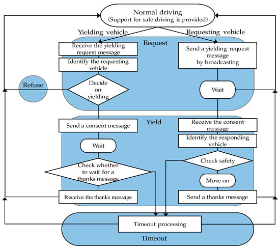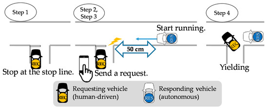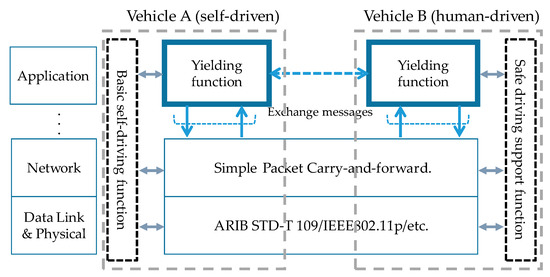 It is assumed that self-driven vehicles have all the basic self-driving functions, including a function to prevent a rear-end collision and that human-driven vehicles have a driving support function designed to ensure high safety. The yielding function is considered to be an additional function for both self-driven and human-driven vehicles. Vehicles exchange messages via inter-vehicle communication. The standard means of inter-vehicle communication adopted in the U.S. and Europe is IEEE 802.11p [8], which operates at the 5.9 GHz band. Japan uses Dedicated Short-Range Communications (DSRC) [9], one of the ITS systems operating at the 5.8 GHz band, for its Electronic Toll Collection (ETC) system. To avoid interference with this system, ARIB STD-T 109 [10], which uses the 700 MHz band, is being studied for use as the standard means of inter-vehicle communication. Since the standardization of the lower layers is in progress as described above, the proposed yielding function is to be implemented at the application layer in the assumed inter-vehicle communication protocol stack, as shown in Figure 4.
