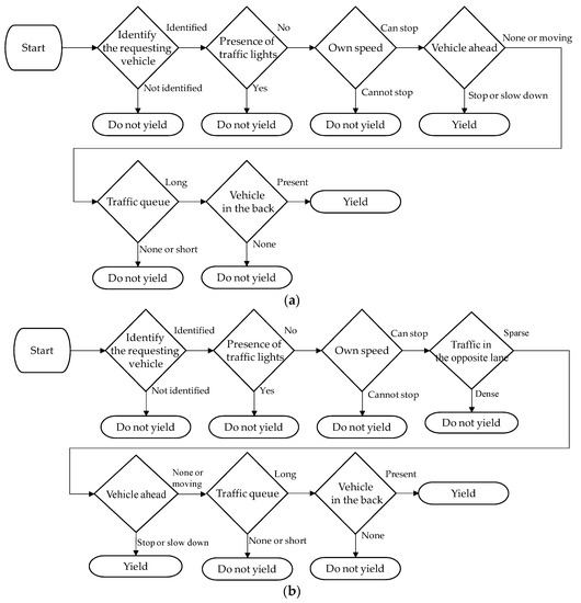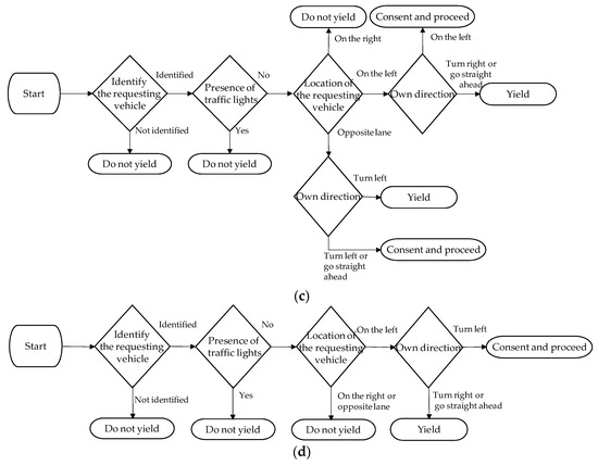 Yielding decision flowcharts. (a) Pattern 1 (turn left from a low-priority road to a priority road) and Pattern 4 (turn right from a priority road to a low-priority road); (b) Pattern 2 (turn right from a low-priority road to a priority road) and Pattern 3 (cross a priority road from a low-priority road); (c) Pattern 5 (go straight at an intersection of two roads of the same width); (d) Pattern 6 (turn right at an intersection of two roads of the same width).