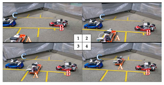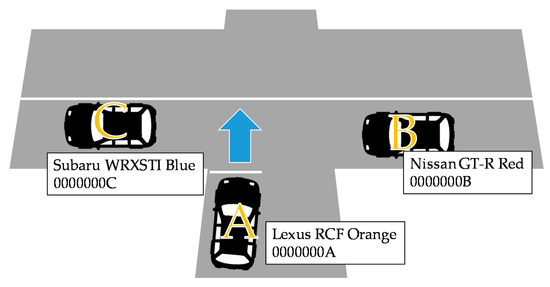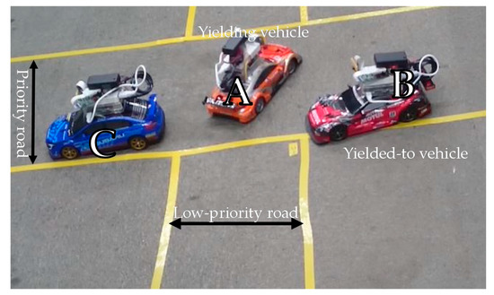 Figure 10 shows the three radio control cars, their roles and the shapes and priority levels of the roads used in the experiment. Table 5 describes the general experimental conditions. Table 6 shows the experimental conditions of the yielding car in different yielding patterns.