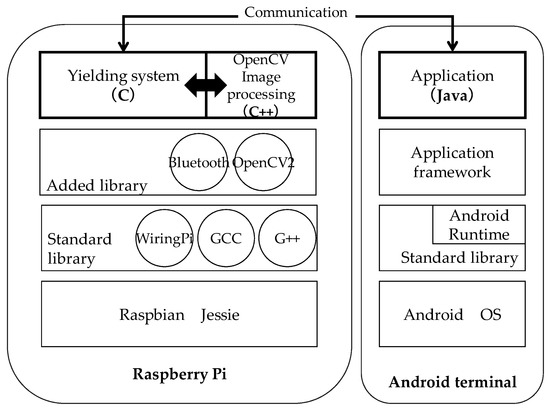 Figure 9 shows the software configuration of the experimental system, including the yielding system and the user interface app for the driver in a human-driven vehicle. The yielding system runs on a Raspberry Pi computer. It calls OpenCV programs to recognize the surroundings. There are three OpenCV programs, one for recognizing a vehicle, one for recognizing the road and one for driving control. Each program is called as necessary. The control of a radio control car is incorporated into the yielding system. Self-driving is achieved by calling the OpenCV program for driving control. In addition to the standard library of Raspberry Pi, Bluetooth, OpenCV2 are added to enable the experimental system to operate.