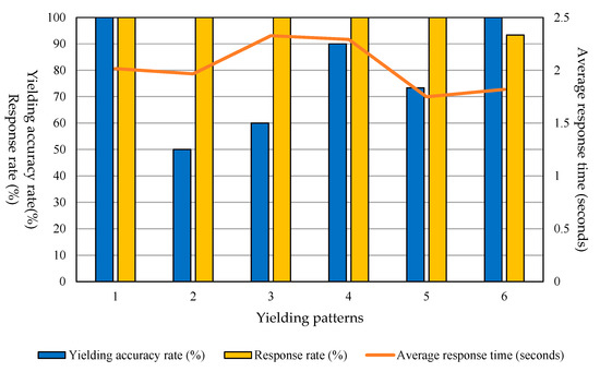 The average response rate for all patterns was 99%. The average response time was 1.996 s and the yielding accuracy rate was 80%. The results for each yielding pattern are shown in Figure 13. Detailed results are shown in Table 7. The item numbers in Table 7 correspond to the yielding patterns in Table 6.