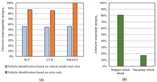 Results of the vehicle identification and detection accuracy experiment. (a) Rate of correctly identifying the communicating vehicle (identification based on vehicle model and colour and identification based on colour only); (b) Rate of correctly detecting surrounding vehicles (stopped vehicle ahead and oncoming vehicle) at the time of yielding decision.