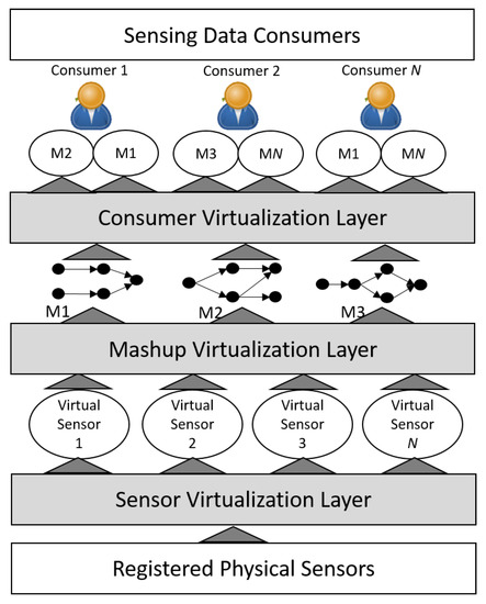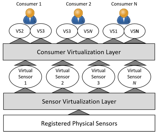 - Virtualization: Sensor virtualization is used to enable the management and customization of devices by clients/applications/consumers, allowing a single device to be linked to one or multiple consumers. Groups of virtual sensors can be made available for specific purposes. Virtualization is illustrated in Figure 2.