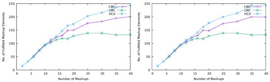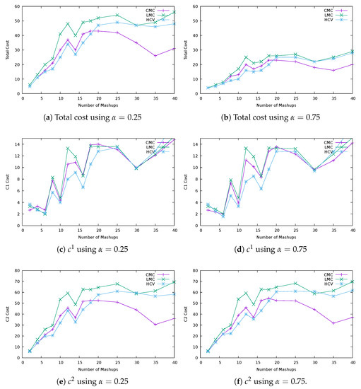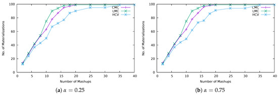 For the last step, different selection criteria have been compared: (i) cheapest materialization cost (CMC) first; (ii) cheapest materialization, of mashup element (node in graph in ) with fewer materialization choices (LMC), first; (iii) cheapest materialization, of mashup element with highest cost variance (HCV), first. The reasoning behind LMC is that more materializations might be possible if critical mashup elements are processed first. Regarding HCV, the reasoning is that a late selection of mashup elements with highest cost variance might result in materializations with higher cost.