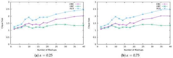 The plots in Figure 4, Figure 5 and Figure 6 show how CMC, LMC and HCV strategies perform regarding the number of materializations (number of virtual Things materialized into physical devices), number of elements from mashups that have been fulfilled (mapped to a virtual Thing and, therefore, materialized into a physical device) and the average number of mashup elements per virtual Thing (average size of clique at Algorithm 1). From such plots, it is possible to observe that the worst strategy is LMC that reaches the total number of available devices more quickly while fulfilling fewer mashup elements than the other strategies. This is confirmed by the relatively low average number of mashup elements mapped to virtual Things (low aggregation level). The approach of LMC is to choose the cheapest materialization from mashup elements with fewer materialization choices, based on the assumption that more materializations would be possible if critical mashup elements were processed first. However, such mashup elements end up being the ones with more incompatible requirements (reason behide having fewer materialization choices), leading to a less efficient use of physical devices. That is, for a specific number of mashups, more devices are used for materialization of virtual Things having a low level of aggregation.