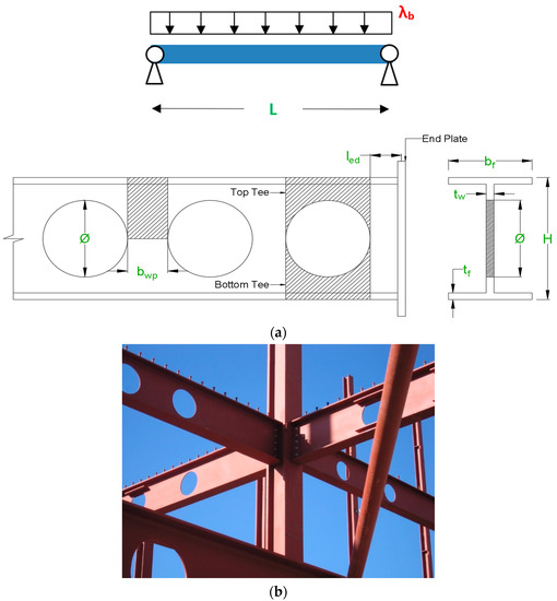Three-dimensional FE models were developed using ABAQUS [26,27], which were then parametrized to generated 3645 simulations. Typical values for the modulus of elasticity and Poisson’s ratio were adopted (E = 210 GPa, ν = 0.3). All models are simply supported where one end allows in-plane rotations but not translations and the other admits translations along the beam axis, beyond in-plane rotations. End twisting rotations were prevented by restraining both the top and bottom flange tips against out-of-plane displacements at the supports. A unitary load was applied to the top flange as a uniformly distributed pressure (then converted to a line load for ANN simulation purposes—see Table 1). The FE mesh adopted was quad-dominated using shell elements of type SR8, which was tested against experimental work conducted by Tsavdaridis and D’Mello [12]), and Surtees and Liu [28], providing accurate and reliable results [29]. The mesh sizes recommended in [30] for web and flanges were adopted. Figure 1a illustrates the various parameters considered in the parametric analysis, whereas Figure 1b illustrates one application of these type of structural members.