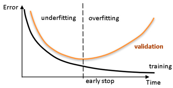 Each connection between 2 nodes is associated to a synaptic weight (real value), which, together with each neuron’s bias (also a real value), are the most common types of neural net unknown parameters that will be determined through learning. Learning is nothing else than determining network unknown parameters through some algorithm in order to minimize network’s performance measure, typically a function of the difference between predicted and target (desired) outputs. When ANN learning has an iterative nature, it consists of three phases: (i) training, (ii) validation, and (iii) testing. From previous knowledge, examples or data points are selected to train the neural net, grouped in the so-called training dataset. Those examples are said to be ‘labelled’ or ‘unlabeled’, whether they consist of inputs paired with their targets, or just of the inputs themselves—learning is called supervised (e.g., functional approximation, classification) or unsupervised (e.g., clustering), whether data used is labelled or unlabeled, respectively. During an iterative learning, while the training dataset is used to tune network unknowns, a process of cross-validation takes place by using a set of data completely distinct from the training counterpart (the validation dataset), so that the generalization performance of the network can be attested. Once ‘optimum’ network parameters are determined, typically associated to a minimum of the validation performance curve (called early stop—see Figure 3), many authors still perform a final assessment of model’s accuracy, by presenting to it a third fully distinct dataset called ‘testing’. Heuristics suggests that early stopping avoids overfitting, i.e. the loss of ANN’s generalization ability. One of the causes of overfitting might be learning too many input-target examples suffering from data noise, since the network might learn some of its features, which do not belong to the underlying function being modeled [38].