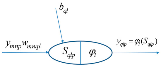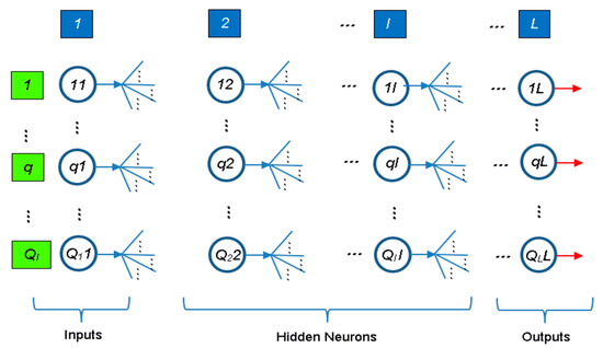 Figure 4 represents a generic MLFN composed of L layers, where l (l = 1,…, L) is a generic layer and ‘ql’ a generic node, being q = 1,…, Ql its position in layer l (1 is reserved to the top node). Figure 5 represents the model of a generic neuron (l = 2,…, L), where (i) p represents the data pattern presented to the network, (ii) subscripts m = 1,…, Qn and n = 1,…, l − 1 are summation indexes representing all possible nodes connecting to neuron ‘ql’ (recall Figure 4), (iii) bql is neuron’s bias, and (iv) wmnql represents the synaptic weight connecting units ‘mn’ and ‘ql’. Neuron’s net input for the presentation of pattern p (Sqlp) is defined as