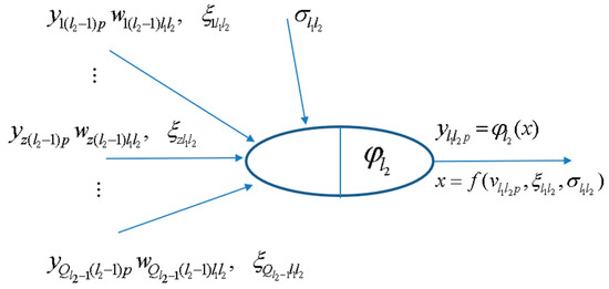 Although having similar topologies, RBFN and MLPN behave very differently due to distinct hidden neuron models—unlike the MLPN, RBFN have hidden neurons behaving differently than output neurons. According to Xie et al. [47], RBFN (i) are specially recommended in functional approximation problems when the function surface exhibits regular peaks and valleys, and (ii) perform more robustly than MLPN when dealing with noisy input data. Although traditional RBFN have 3 layers, a generic multi-hidden layer (see Figure 4) RBFN is allowed in this work, being the generic hidden neuron’s model concerning node ‘l1l2’ (l1 = 1,…,Ql2, l2 = 2,…, L − 1) presented in Figure 6. In this model, (i) and (called RBF center) are vectors of the same size ( denotes de z component of vector , and it is a network unknown), being the former associated to the presentation of data pattern p, (ii) is called RBF width (a positive scalar) and also belongs, along with synaptic weights and RBF centers, to the set of network unknowns to be determined through learning, (iii) is the user-defined radial basis (transfer) function (RBF), described in Equations (20)–(23), and (iv) is neuron’s output when pattern p is presented to the network. In ANNs not involving learning algorithms 1–3 in Table 4, vectors and are defined as (two versions of where implemented and the one yielding the best results was selected)