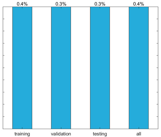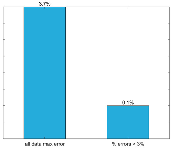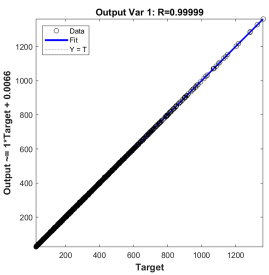 Finally, results yielded by the proposed ANN, in terms of performance variables defined in Section 3.4, are presented in this section in the form of several graphs: (i) a regression plot per output variable (Figure 8), where network target and output data are plotted, for each data point, as x- and y- coordinates, respectively—a measure of quality is given by the Pearson Correlation Coefficient (R), as defined in Equation (1); (ii) a performance plot (Figure 9), where performance (average error) values are displayed for several learning datasets; and (iii) an error plot (Figure 10), where values concern all data (iii1) maximum error and (iii2) % of errors greater than 3%. It is worth highlighting that all graphical results just mentioned are based on effective target and output values, i.e. computed in their original format.