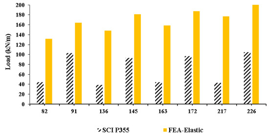 The bar chart in Figure 11, where beams numbers in the horizontal axis are referenced to the data point ID in the ANN dataset [31], presents (i) the design loads given by SCI-P355 [15], and (ii) the FEA-based elastic buckling loads obtained from this work. As expected, SCI-P355 yielded significantly lower loads and it is worth noting that the differences between the two approaches do not produce the same percentage variance in load estimates for the 8 randomly selected beams. In particular, for slender web-posts (i.e., closely spaced web openings) such as in beams 82, 136, 163, and 217, buckling of the web-post will always govern the design in SCI-P355, hence the reduced design load. As for the FEAs, parameter led (end web-post distance to the support—see Figure 1a) governs the design for widely spaced web openings. SCI-P355 does not consider the distance led and recommends it to be greater than 50% of the opening diameter. In this work, the opening diameter and web-post width were taken within the recommended design limits (1.25 < H/Φ < 1.75 and 1.08 < (bwp + Φ)/Φ < 1.5, respectively).