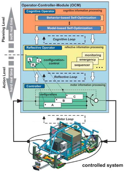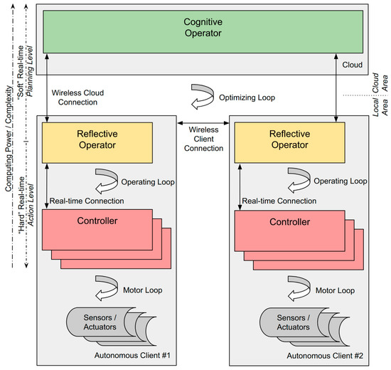 Figure 3). The controllers interact directly with actuators and sensors in a motor loop. The reflective operator processes the data from the controllers in an operating loop. The reflective operator decides in which configuration the controllers are running and controls the robots to fulfill their given task(s) (e.g., to navigate through a room). The highest layer, the cognitive operator, runs an optimizing loop for the lower layers to optimize the behavior of the system (e.g., to reduce power consumption). A Human–Machine Interface (HMI) can be implemented to both of the two operators, as an HMI is not required to fulfill hard real-time constraints. The architecture is divided into two parts: the local part, which can run the robot autonomously, and the cloud area, to add additional computing power (e.g., to calculate complex (optimizing) software algorithms).