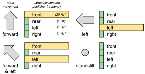 Figure 4 describes this adaptive publisher frequency with the example of ultrasonic sensors attached on all four sides of a mobile robot. Data from the front ultrasonic sensor is essential if the robot is driving forward. The front ultrasonic sensor will publish its data with 20 Hz. If the robot stands still, all four sensors are running in a standby mode, publishing its data only with 1 Hz.
